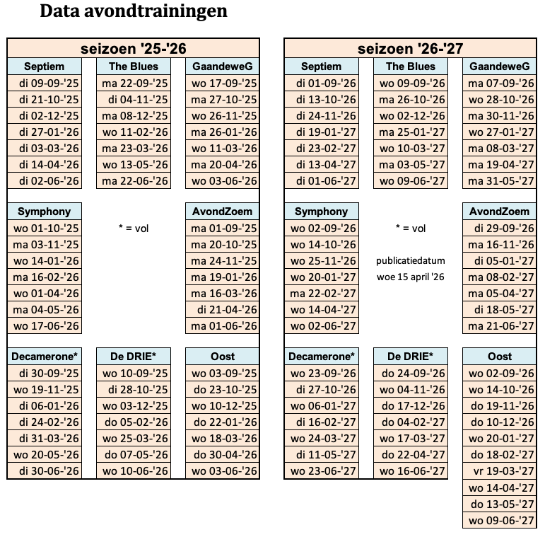 Onder de knoppen hieronder vind je de data van de SENSE training en de data van de avondgroepen. De data voor de TjongerBrug vind je in de agenda van de website door te zoeken op TJongerBrug.